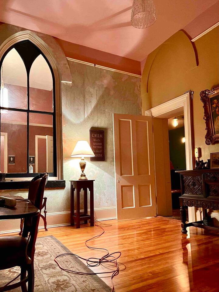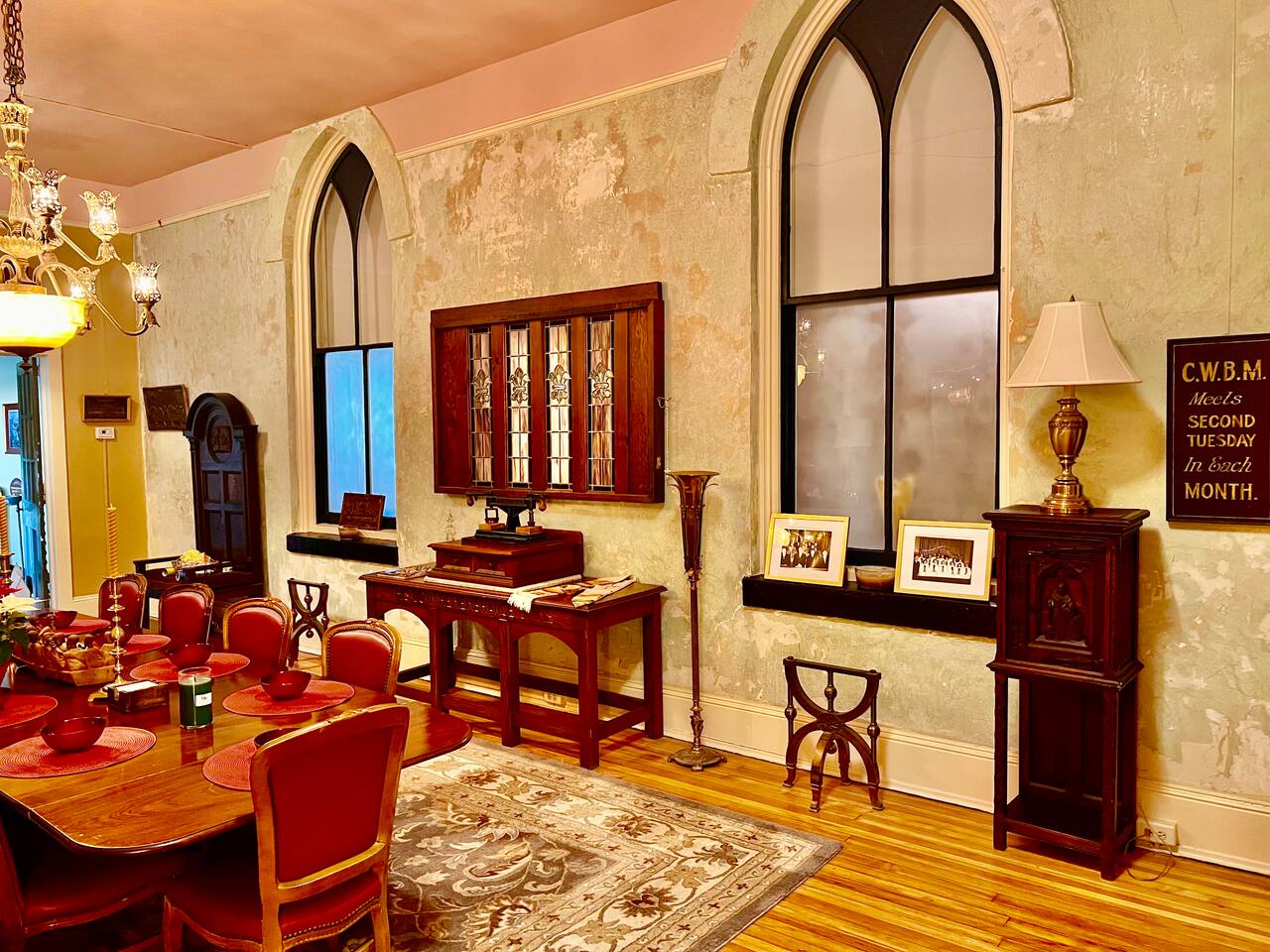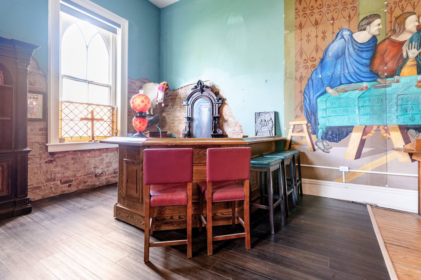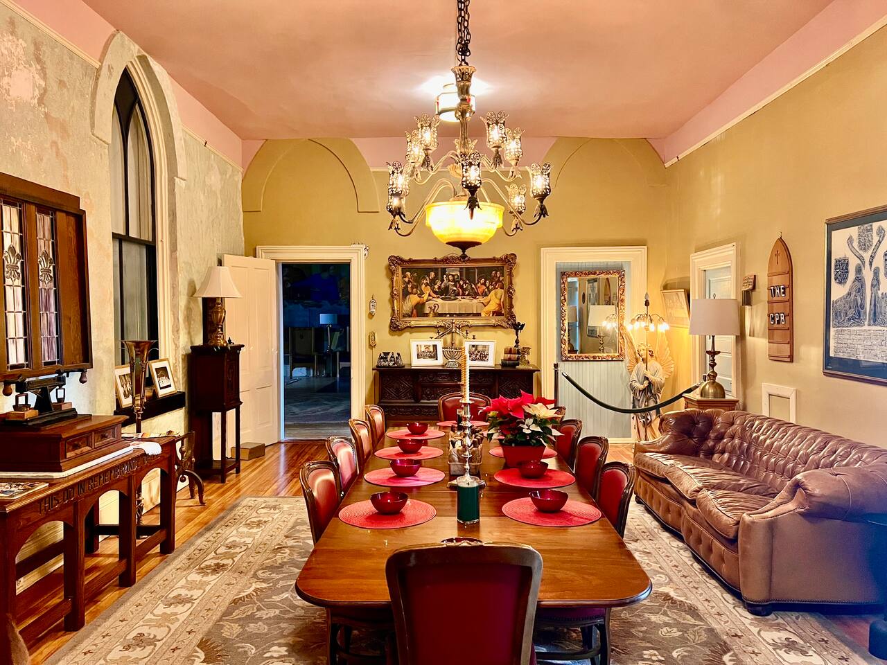 In the "City of Churches" the very first house of worship was constructed on this spot in the 1820's by the Presbyterians. Later in the 19th century, the Presbyterian built our amazing 9000 sqft Gothic Revival church. You'll have access to 3 bedrooms... one was the former Pastor Study, the second part of the former Nursery and the third a former sitting room. Each bedroom has its own climate control and large light-filled broken arch windows. The primary living space is 1500 sqft and served as the former Fellowship Hall. This space has a stage with a large 100" TV (that's right, 100"), ample seating, and even a bar (altar?). The dining room comfortably seats 8-10 at the 11' table. There is plenty of other seating in the room as well. The kitchen is massive and the counter space is overwhelming... typical of church kitchens designed to feed the masses. The appliances are brand-new (the fridge even makes ice cubes in multiple sizes!). The sanctuary is not part of the listing, but we can show you around or grant access at your own risk. It's something special :) ... a space graced by the oldest organ in Danville, an almost 200-year-old bell with a place in history, and amazing stained glass windows that includes an 8' cylindrical rose glass window.